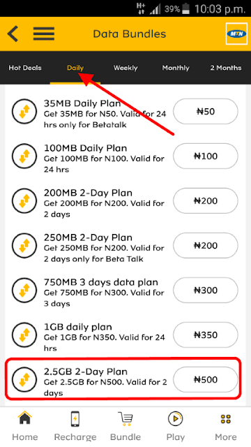 One of the leading telecommunication network in Nigeria, MTN has quietly added a more affordable bundle to its data plans, 2.5GB for N500. Currently, the plan is only available via MyMTN app.